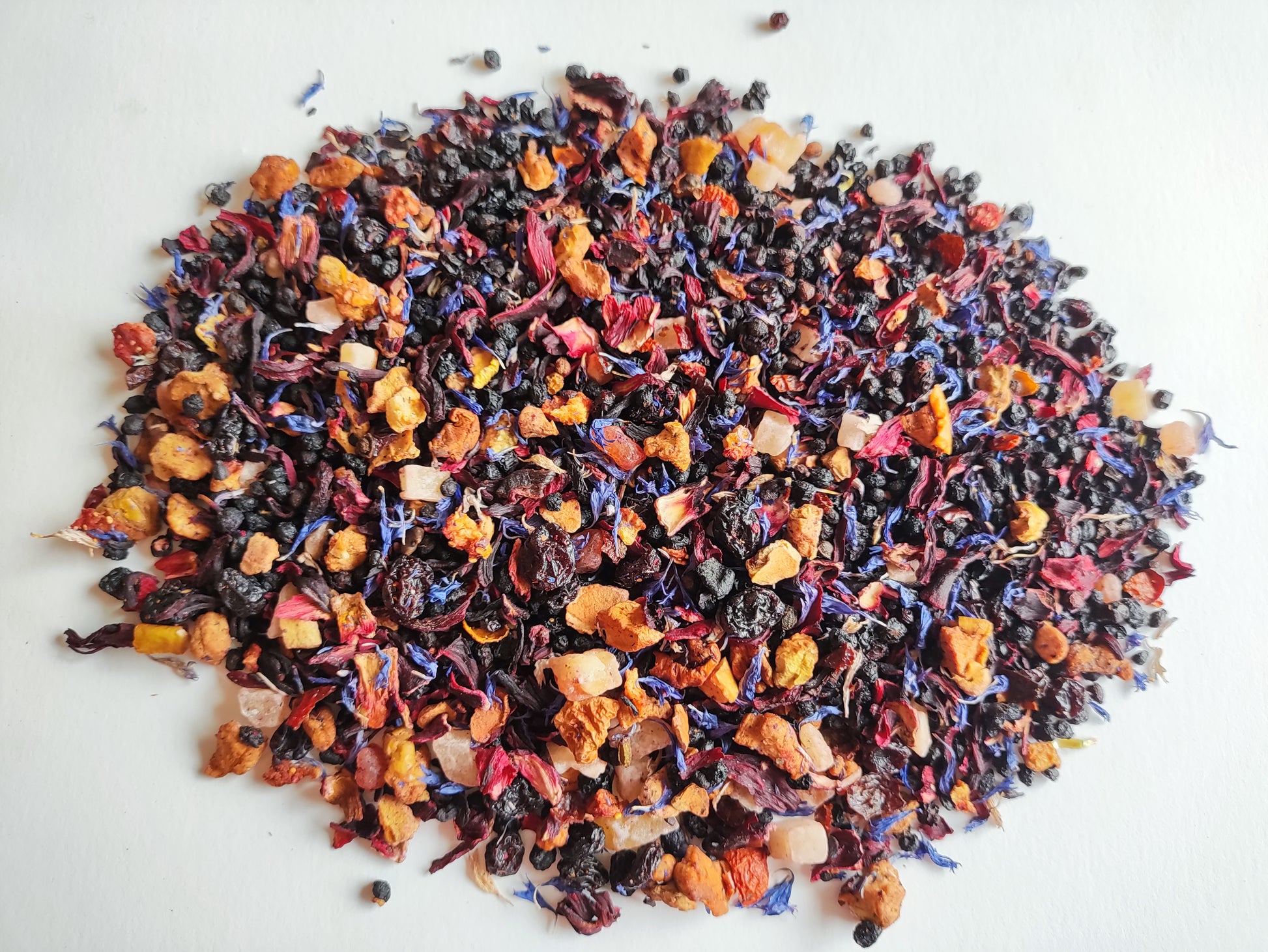 This tea is a blend of elderberries, hibiscus blossoms, currants, papaya cubes, apple pieces, rose hip peel, strawberry pieces, blue cornflower blossoms, blackcurrants, and blueberries.